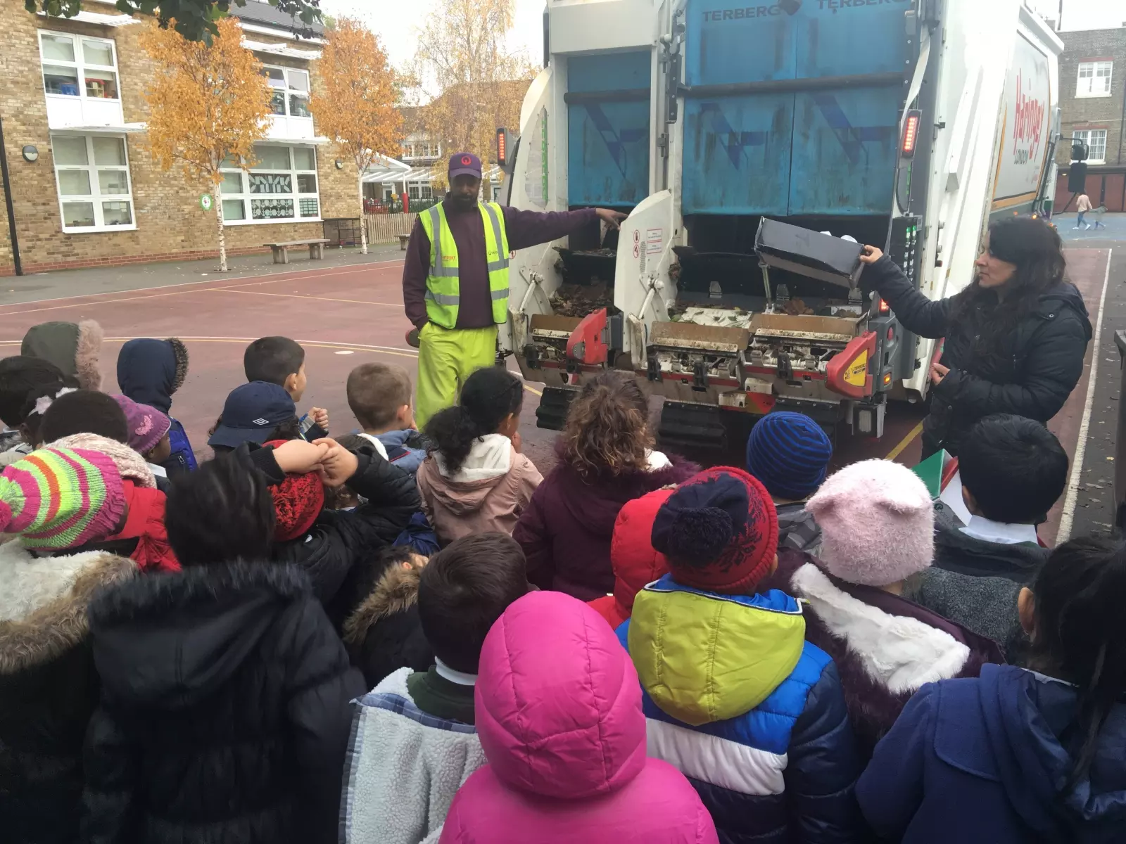 Pupils were treated to the opportunity to sit in the cab and have a play with the buttons, as well as being allowed to throw some recyclable items into the back of the truck and see Munch in action! The foreman in charge talked them through a day in the life of a bin collection man and they had the chance to ask any questions about where their rubbish and recycling goes and what we do with it in Haringey.